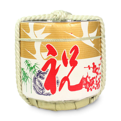 The golden designs of the lucky motif, "Shochikubai" (pine, bamboo and plum) are depicted on a red background. The kanji character, "Iwai" is simpl...